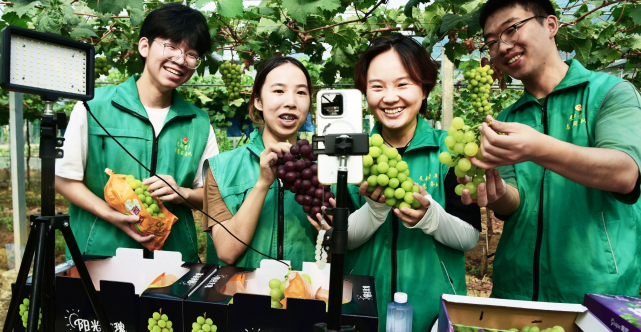 在江苏省镇江市官塘桥街道,江苏大学“青春耒耜”服务队的志愿者来到平山村果农的葡萄园里,开展“果园直播 助农增收”活动,通过田间公益助农促增收,助力乡村振兴。