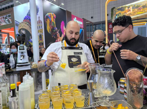 图为来自委内瑞拉的展商正在向客商介绍当地的特色果汁。