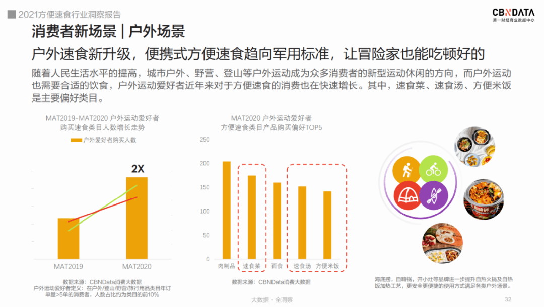 随着登山、野营等户外运动越来越受欢迎,户外爱好者对速食产品的消费也在快速增长。过去的军用食品比如压缩饼干、午餐肉罐头,如今也不断升级,像自热速食、干米饭等第三代军用食品拥有更强的便携性、风味完整性和营养丰富性。以自嗨锅为代表的品牌,基于军用速食技术,推出一系列创新口味的方便速食,以满足消费者的多场景就餐需求。