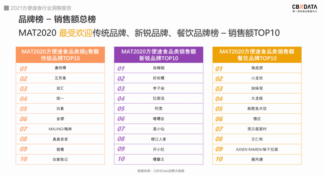 方便速食市场的消费场景越来越多元,也能够满足消费者更加个性细分的需求。在品牌销售上,除了像 康师傅、五芳斋、双汇这样的老牌方便速食品牌与 海底捞、小龙坎等餐饮品牌,还有 自嗨锅、好欢螺、李子柒等新锐品牌凭借精准的洞察与产品创新实力冲出重围。