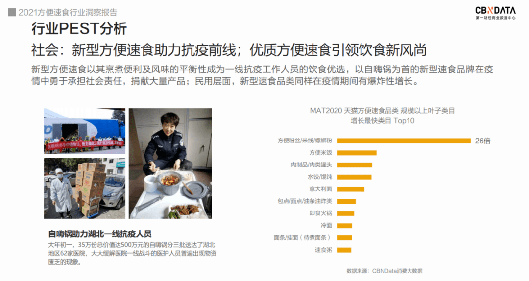 快速的增长背后是 政策、经济、社会与技术等客观环境的共同推动。去年春节,以自嗨锅品牌为首的新型速食品牌向湖北捐献了大量产品,大幅缓解了物资匮乏。这些方便速食也陪伴了普通消费者度过了宅家抗疫的日子,其中 方便粉丝、米线、螺丝粉等新型速食品类实现爆炸式增长。