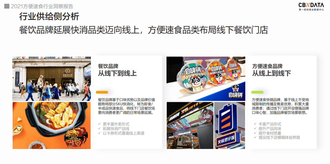 餐饮品牌推出自热火锅等快消品类,从线下迈向线上,拓展到更日常的消费场景,而 方便速食品牌则开始布局线下餐饮门店,推动品牌的全渠道布局。