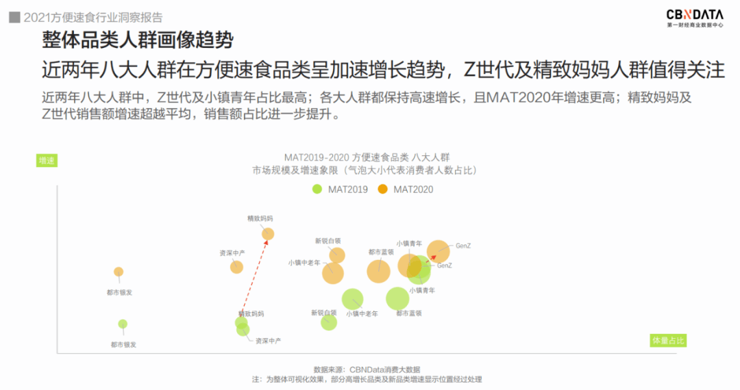 在Z世代、新锐白领、资深中产、都市银发、精致妈妈、小镇中老年、都市蓝领、小镇青年这八大消费群体当中, 年轻的Z世代与小镇青年的方便速食消费占比最高,同时Z世代与精致妈妈凭借较高的增速引起关注。