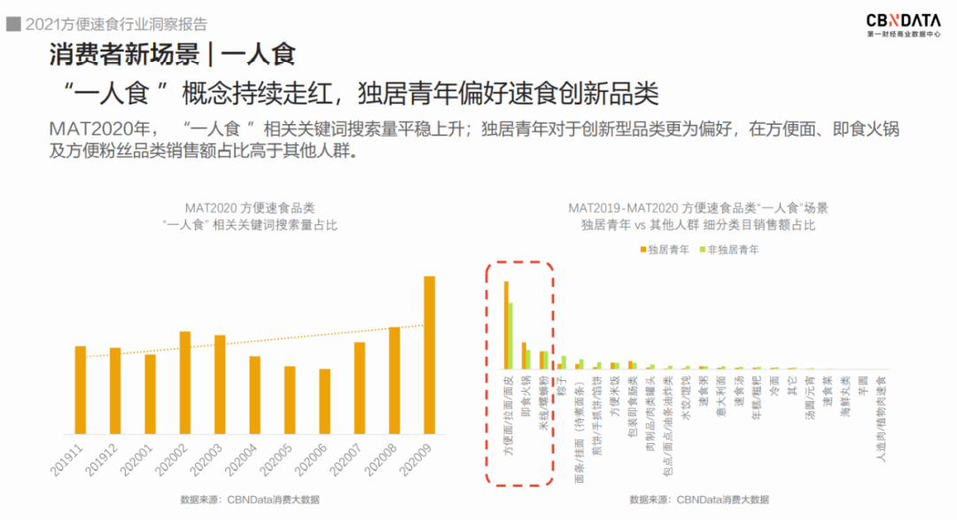 伴随着单身经济兴起的“一人食”,越来越多地成为当下年轻人的消费场景。根据CBNData《报告》,2020年“一人食”相关关键词的搜索量逐渐上升,许多餐厅也贴心地推出单人就餐隔间和一人份的菜单,让一个人吃饭不再是孤独而尴尬的事。而独居青年在家则更青睐方便面、即食火锅和方便粉丝等品类,他们在口味与品类选择上也更为专一,且最爱酸辣和麻辣味。
