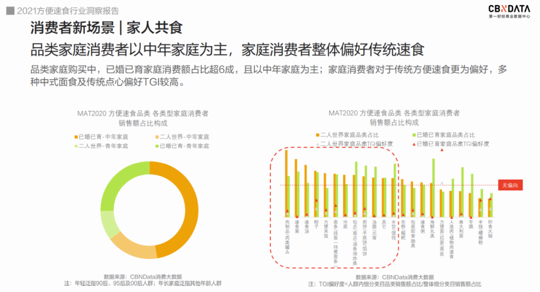 在各类家庭消费者当中,中年家庭占比较高。与单身消费者相比,家庭消费者更偏好中式面食点心等传统方便速食,覆盖的品类也更丰富。