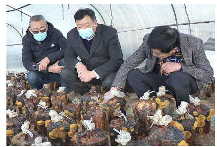 王店村党总支书记兼村委会主任于晓东(中)和王店村第一书记肖春达(左一)查看桑黄生长情况
