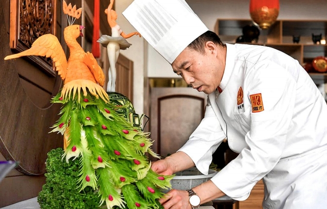 图为厨师制作的“孔雀迎宾”食雕。