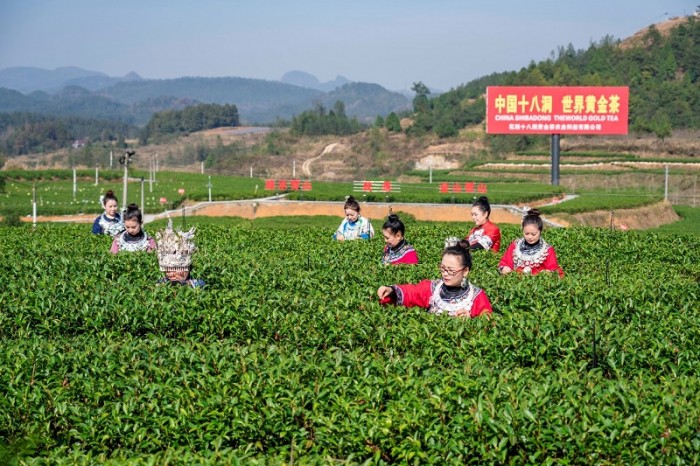有着古老茶树品种的花垣十八洞黄金茶产于湘西花垣县,这里位于 “神秘湘西”土壤中的富硒带、植物群落里的亚麻酸带、气候上的微生物发酵带“三带”交汇核心地段,风景秀美,云雾缭绕。是发展生态有机茶叶的天选之地。