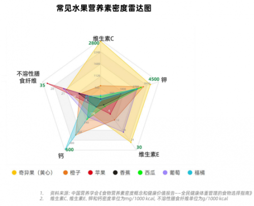 《指南》研究表明,黄心奇异果的维生素C营养素密度是草莓的1.8倍、橙子的4倍,每日100g黄心奇异果可提供204 mg维生素C,满足成人日需量(100mg)。此外,黄心奇异果的膳食纤维密度每1000千卡可达20.50克,且低GI,在促进肠道健康、助力体重管理、控制血糖方面具有独特优势。