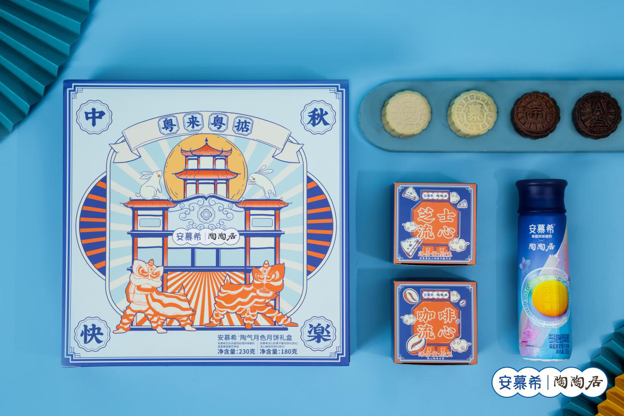 在中秋即将到来之际,安慕希与陶陶居联名,推出限量月饼礼盒,上新可以“喝”的月饼——咸蛋黄莲蓉月饼限定口味;并搭配以酸奶馅的月饼——安慕希咖啡流心和安慕希芝士流心。礼盒的设计也充满了浓浓的粤式风情,广州经典骑楼跃然于礼盒之上,可爱的舞狮位列两旁。是中秋送礼佳品,更是精美的艺术品。