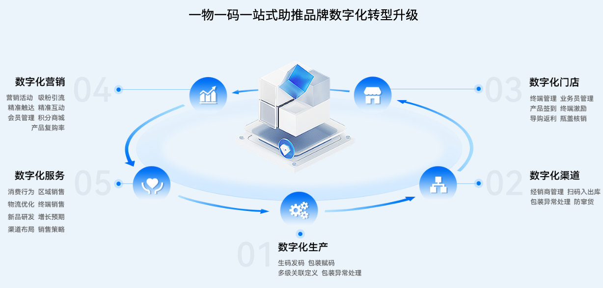 爱创科技一体化的云发码服务,为每一件最小包装单元产品创建唯一数字身份,从码生成到激活全流程封闭管理,全程密文传输,关联校验,实现数据防泄漏、防篡改、防破坏、防抵赖。