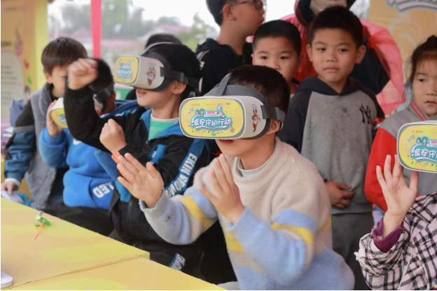食安课程结束后,孩子们兴高采烈地投入到各项体验活动中。“你说我猜”、“找不同”、“食安大富翁”以及VR观影这些互动游戏的出现让校园中欢声笑语不断。“我们展示的是康师傅航天VR视频教材,FD食品冻干技术应用在太空食品当中,也用在了方便面蔬菜包当中,寓教于乐的方式能充分调动学生们的学习兴趣。”互动中,老师们使用展板、开展问答积极调动学生参与和学习,让孩子们把健康饮食、健康科普的知识牢记心间。
