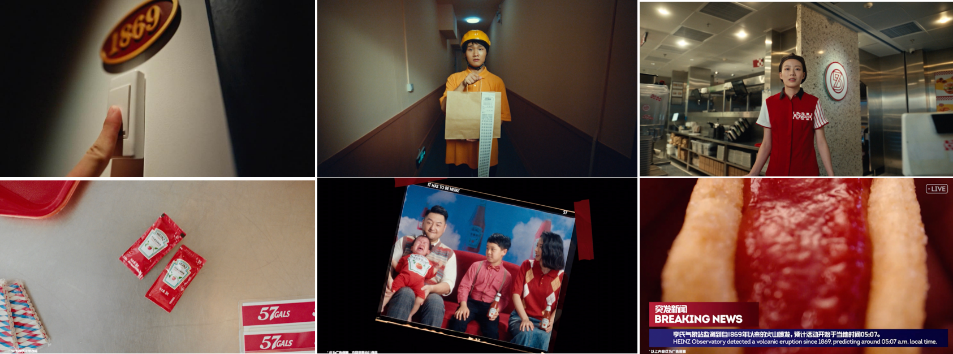 比如视频场景中的门牌号是亨氏诞生年份1869年;外卖小票上餐厅名由亨氏灵魂数字57演变,尽管亨氏包装一直在变化,“57”这个数字一直存在于亨氏番茄沙司的包装瓶上;布景真的打造了一家名叫57gals的餐厅,墙上也悬挂着57gals的logo;连服务员工牌这种细节也不放过;全家福相框上印的是亨氏英文主张“IT HAS TO BE HEINZ”以及灵魂数字57;连突发新闻也在玩1869年和灵魂数字57的梗。
