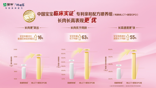 其次,在助力宝宝生长发育方面,亲和配方也展现出了显著效果。临床喂养研究显示,食用蒙牛瑞哺恩亲和配方的宝宝,在体重和身高增长方面均优于同龄宝宝。具体而言,相较于食用普通奶粉的宝宝,食用亲和配方的宝宝的体重能够多增加16%,有63%的宝宝长肉优于同龄;同时,55%的宝宝的身高增长速度也优于同龄。