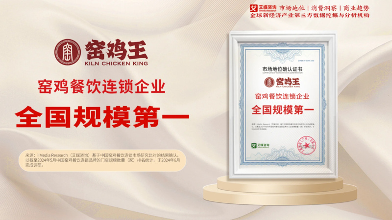 2024年6月,窑鸡王获全球新经济产业第三方数据挖掘和分析机构iiMedia Research(艾媒咨询)授予的“中国窑鸡餐饮第一品牌”“窑鸡餐饮连锁企业全国规模第一”“窑鸡餐饮连锁企业全球规模第一”“中国窑鸡餐饮销量第一” 四项市场地位确认。