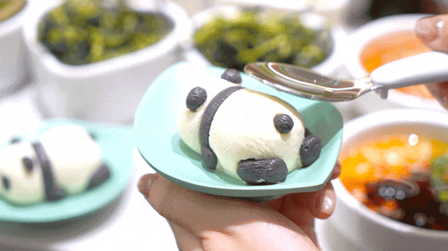 虽然说餐饮业用熊猫做IP的品牌并不少见,但是一围把熊猫这个视觉符号用到了极致:门口粉色腮红的熊猫立牌、熊猫慕斯蛋糕、服务员帽子上趴着个小熊猫、各种熊猫周边……甚至连装香油的瓶子都是熊猫样式。