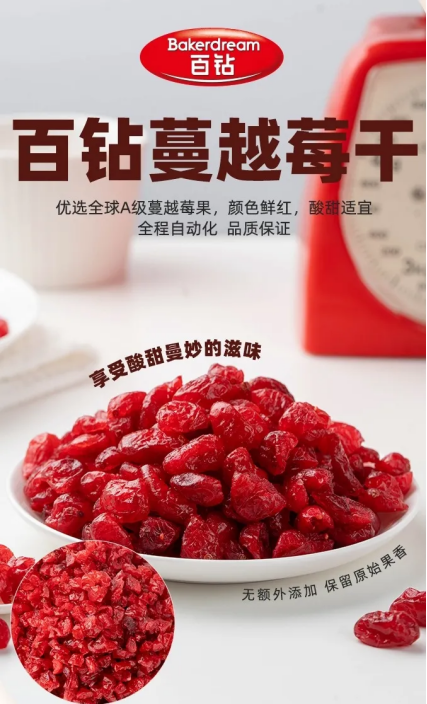 多样化口味的需求:消费者对于食品的口味要求日益多样化,单一口味的食品已难以满足市场需求。百钻蔓越莓干以其独特的果香和酸甜口感,为食品提供了丰富的层次感,满足了消费者对多样化口味的需求。