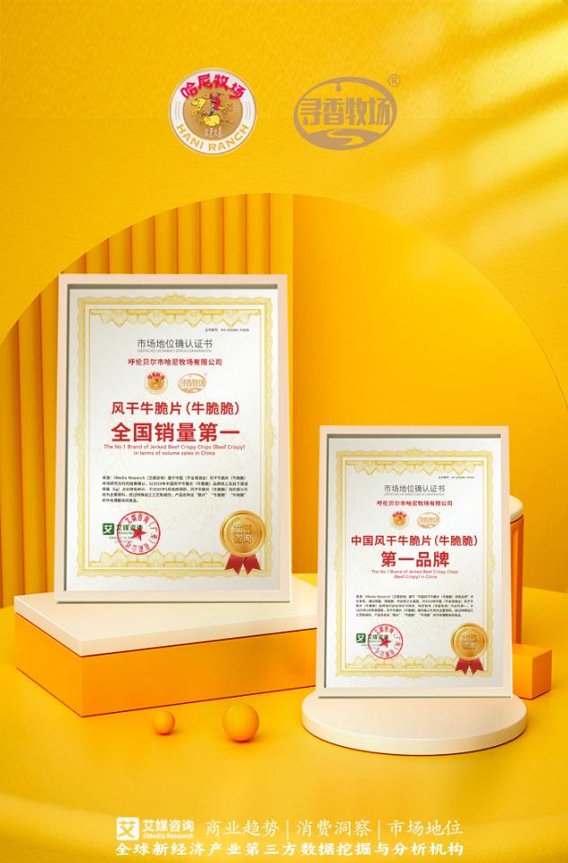 近期,哈尼牧场获全球领先的新经济产业第三方数据挖掘和分析机构iiMedia Reearch(艾媒咨询)授予的“风干牛脆片(牛脆脆)全国销量第一”“中国风干牛脆片(牛脆脆)第一品牌”两项市场地位确认。