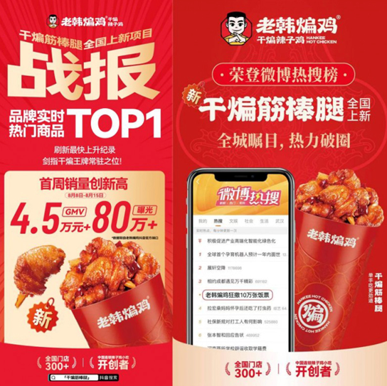 在一系列“组合拳”下,老韩煸鸡完美打出了消费者对干煸筋棒腿的产品认知,不少门店甚至出现卖断货的情况,在活动结束后,干煸筋棒腿已经成为老韩煸鸡名副其实的爆款产品。