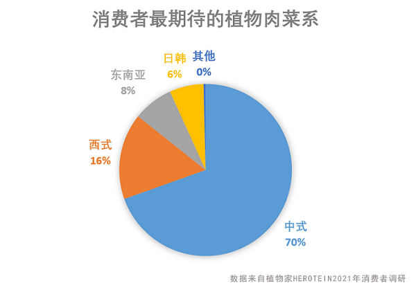 在问卷选项中的中式菜肴、西式菜肴、东南亚菜肴、日韩菜肴等其他菜肴中,有69.6%的受访者最期待用植物肉烹饪的中式菜肴。其次,16.2%的受访者选择西式菜肴,7.5%选择东南亚菜肴,而日韩菜肴的选择率只有6.4%。