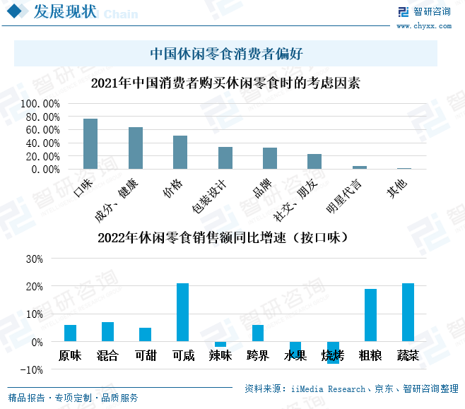 年轻消费群体追求新潮消费也讲究健康养生,消费理念和习惯都带有显著的特征性。这一点在休闲食品领域表现得尤为明显,调查显示,我国消费者在购买休闲零食时往往更考虑口味(76.9%)、健康(超60%),消费者对休闲零食的消费需求逐渐从以温饱为主转向追求口味与健康化,这也为众多品牌带来了发展的新思路。